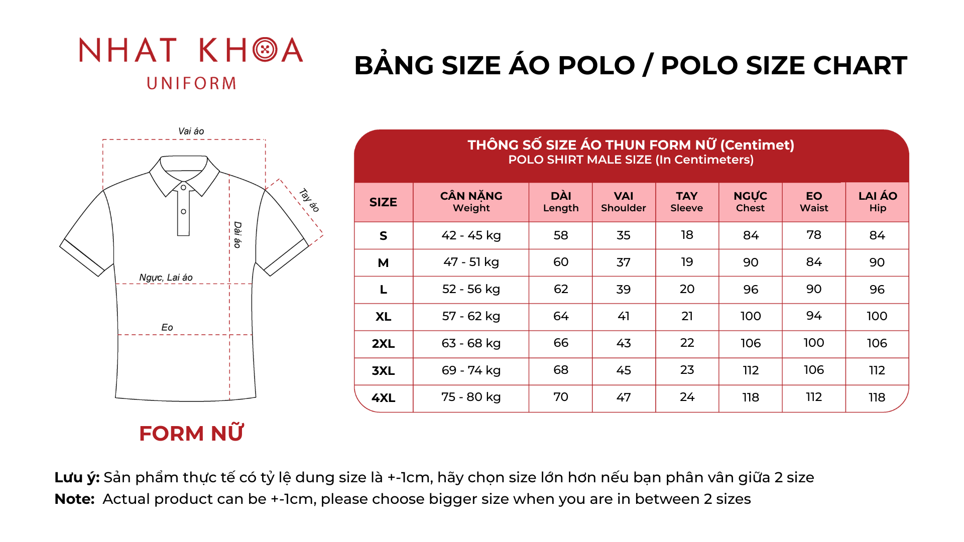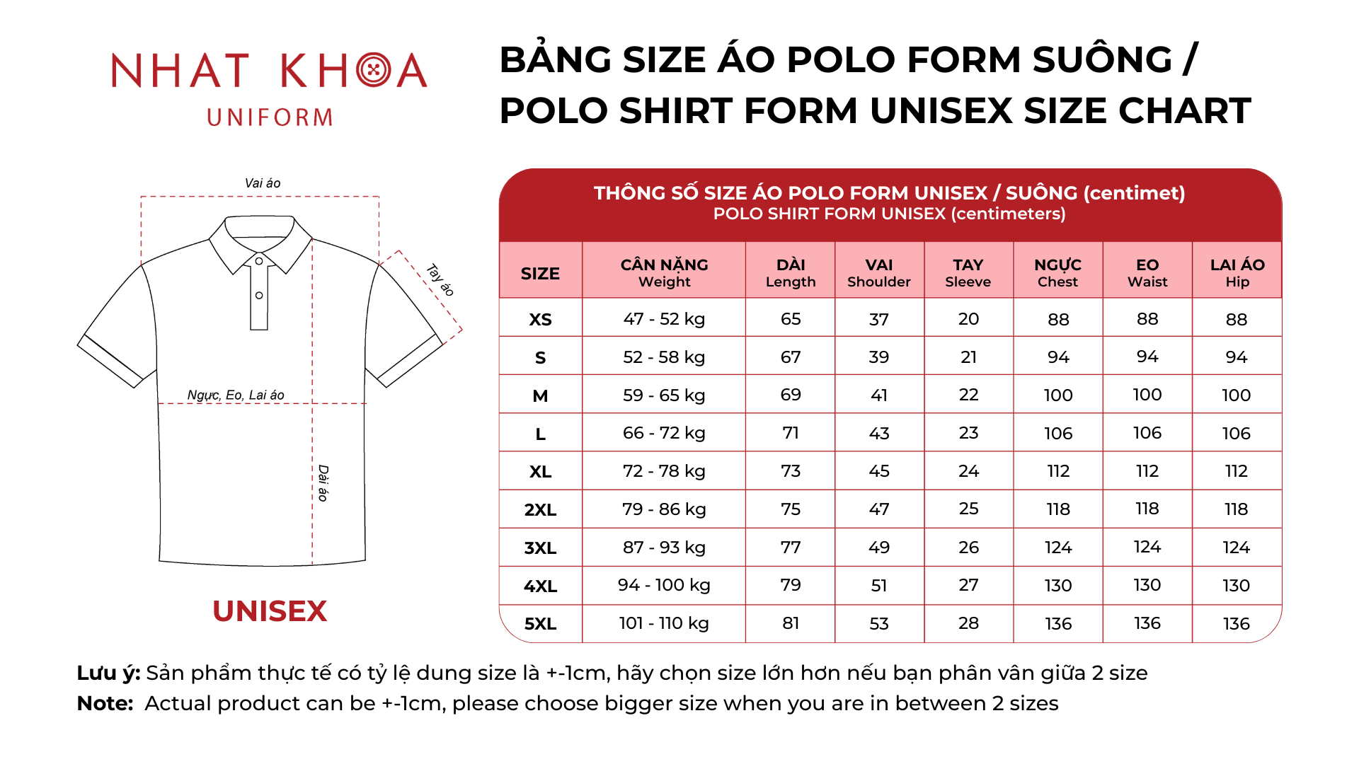 Để đảm bảo áo polo đồng phục vừa vặn và thoải mái nhất cho từng thành viên, việc lựa chọn đúng kích cỡ là rất quan trọng. Nhất Khoa Uniform cung cấp bảng size chi tiết, phù hợp với nhiều dáng người khác nhau. Dựa vào bảng dưới đây, khách hàng có thể dễ dàng chọn size hoặc liên hệ với chúng tôi qua hotline 082 345 1195 để được tư vấn thêm.