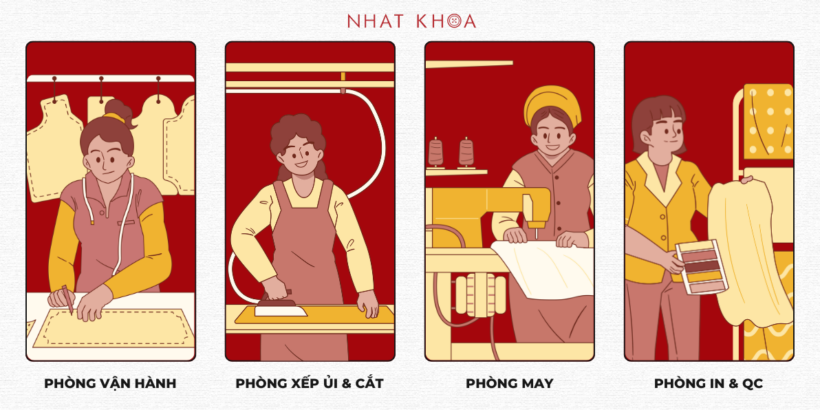 Để đảm bảo quy trình sản xuất diễn ra trơn tru, hiệu quả và đạt chất lượng cao nhất, Nhất Khoa đã tổ chức đội ngũ sản xuất thành các phòng ban chuyên môn hóa, mỗi phòng ban đảm nhận một vai trò quan trọng: