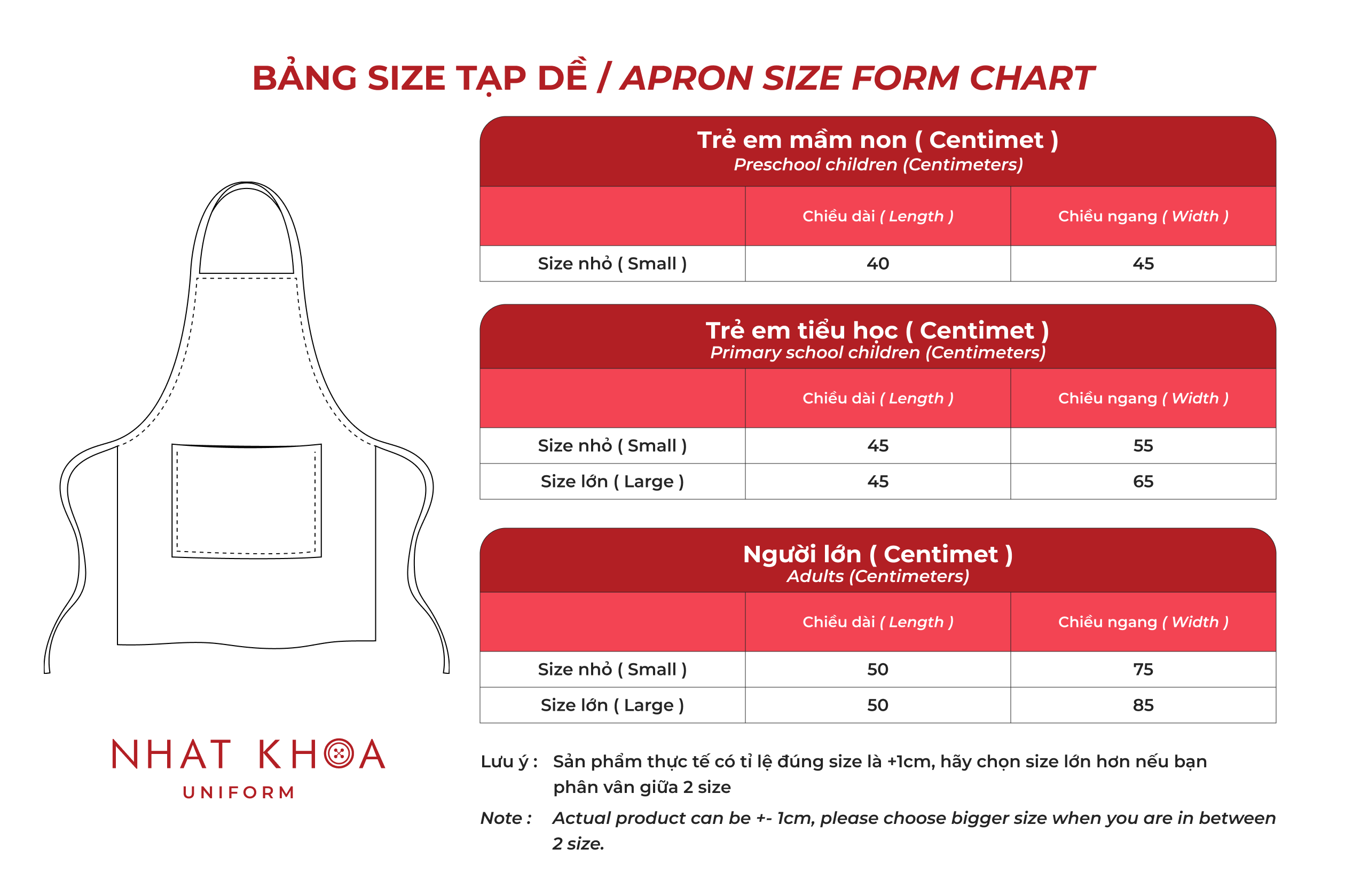 To ensure proper fit and comfort, selecting the right apron size is essential. Nhất Khoa Uniform provides detailed size charts and also offers size customization based on customer requirements.