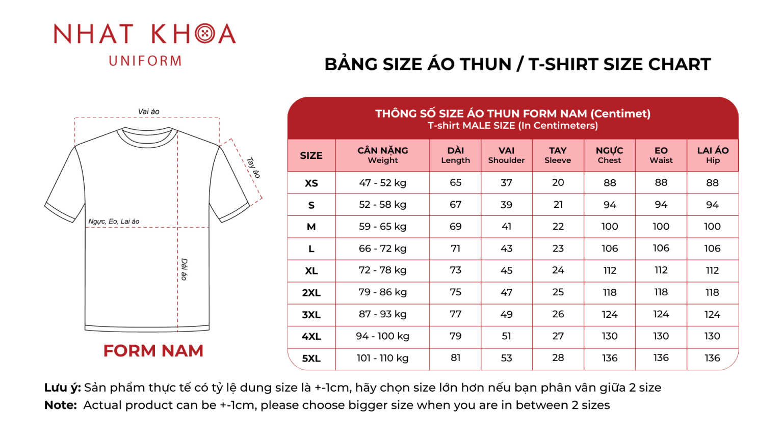 Nhat Khoa Uniforms’ size chart is designed to accommodate a wide range of body types. We offer two main sizing options: One is a unisex size with a straight fit, suitable for both men and women. The other is a women’s size with a fitted design around the stomach and waist, helping to create a more flattering silhouette. Customers can rest assured that the shirts will fit perfectly and meet their needs.