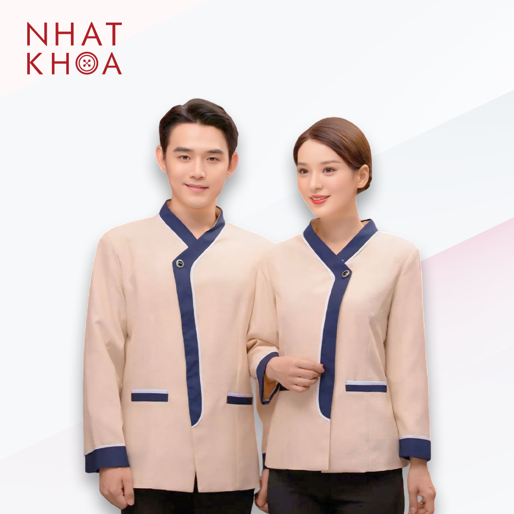 This uniform design is particularly suitable for receptionists, waitstaff, and lobby managers at upscale restaurants, 4-5 star hotels, resorts, or conference and wedding venues. The cream and navy blue color scheme creates a clean, reliable, and professional feel, helping the brand make a positive first impression on customers.