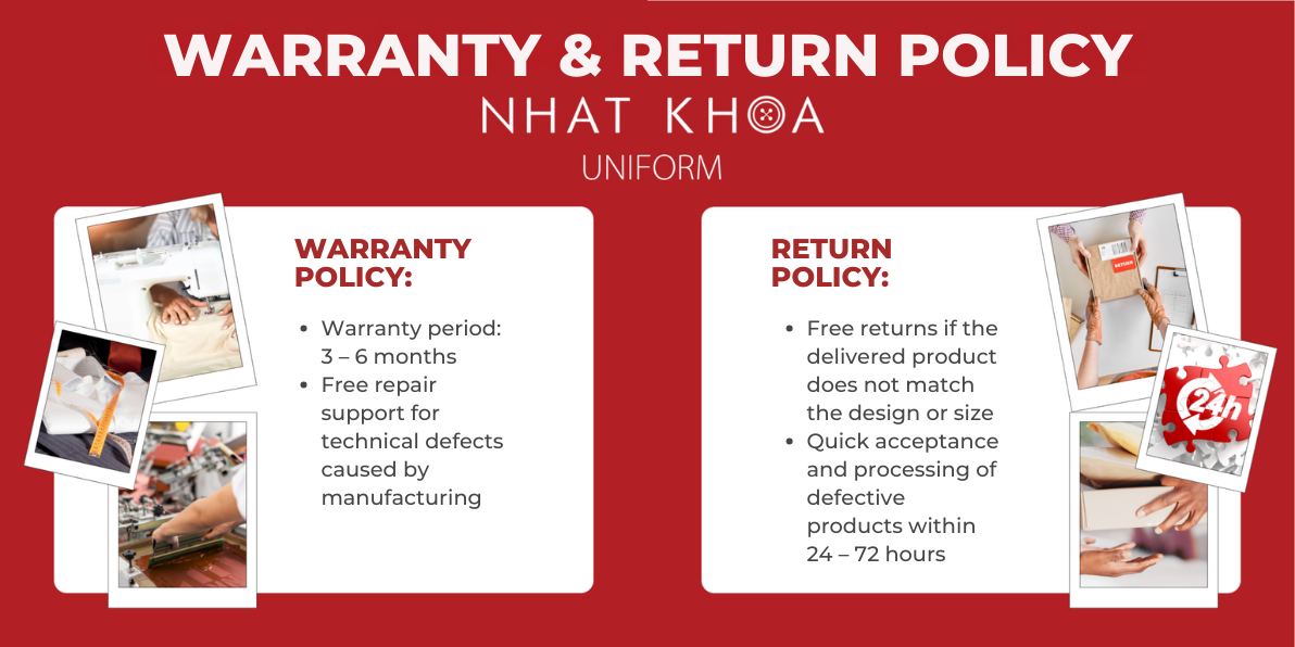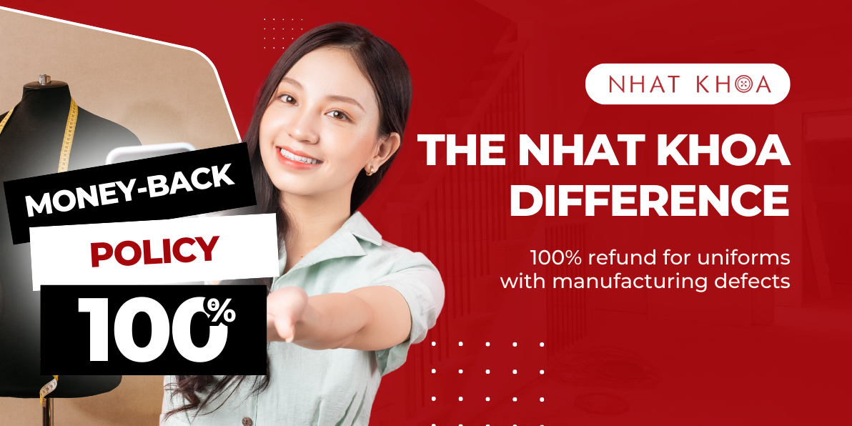 Nhat Khoa Uniform understands that customer satisfaction is a key factor for success. Therefore, we apply a 100% refund policy for uniform products that contain manufacturing defects, ensuring absolute peace of mind when placing orders with us.