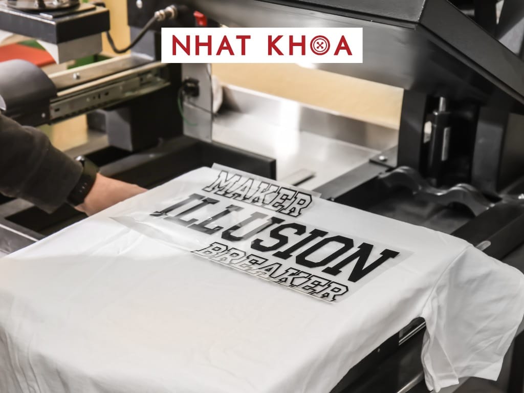 Nguyên lý: Hình ảnh được in lên giấy chuyển nhiệt, sau đó dùng nhiệt độ cao để ép hình ảnh từ giấy lên vải.