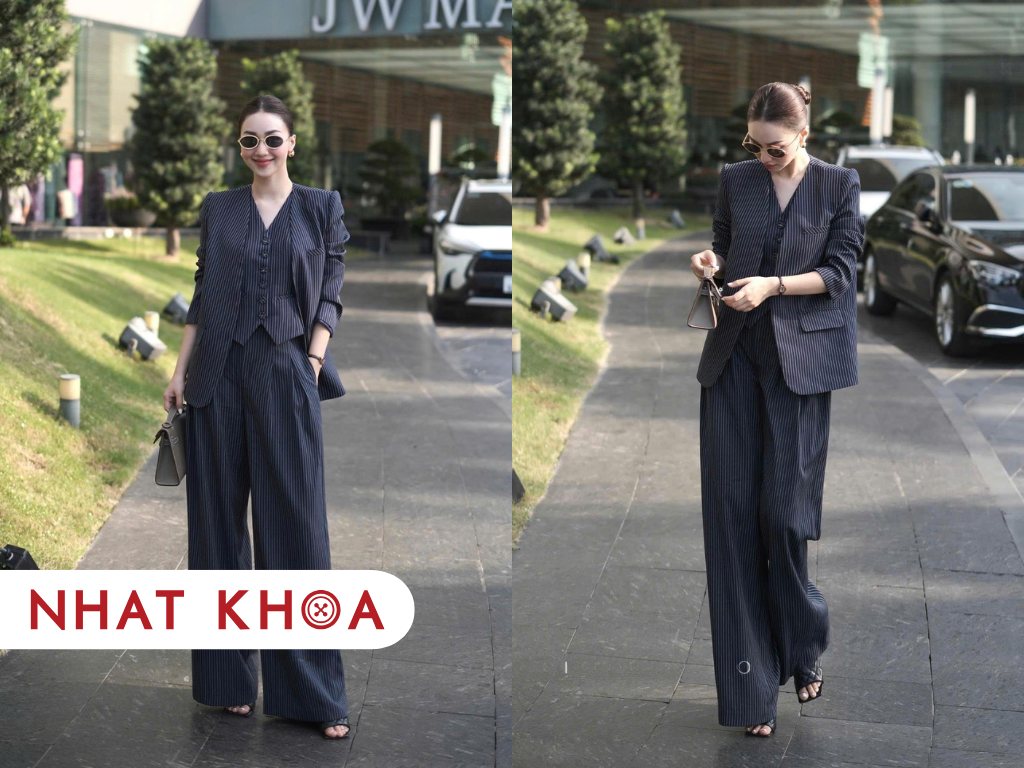 Đây là mẫu bộ kẻ công sở kinh điển nhưng không bao giờ lỗi mốt. Phiên bản 2025 được làm mới với phom dáng áo blazer suông nhẹ và quần ống đứng, tạo nên vẻ ngoài thanh lịch và quyền lực. Ưu điểm lớn nhất của họa tiết sọc dọc là tạo hiệu ứng thị giác giúp người mặc trông cao và thon gọn hơn. Mẫu này phù hợp với mọi môi trường công sở, đặc biệt là những vị trí đòi hỏi sự chuyên nghiệp cao.
