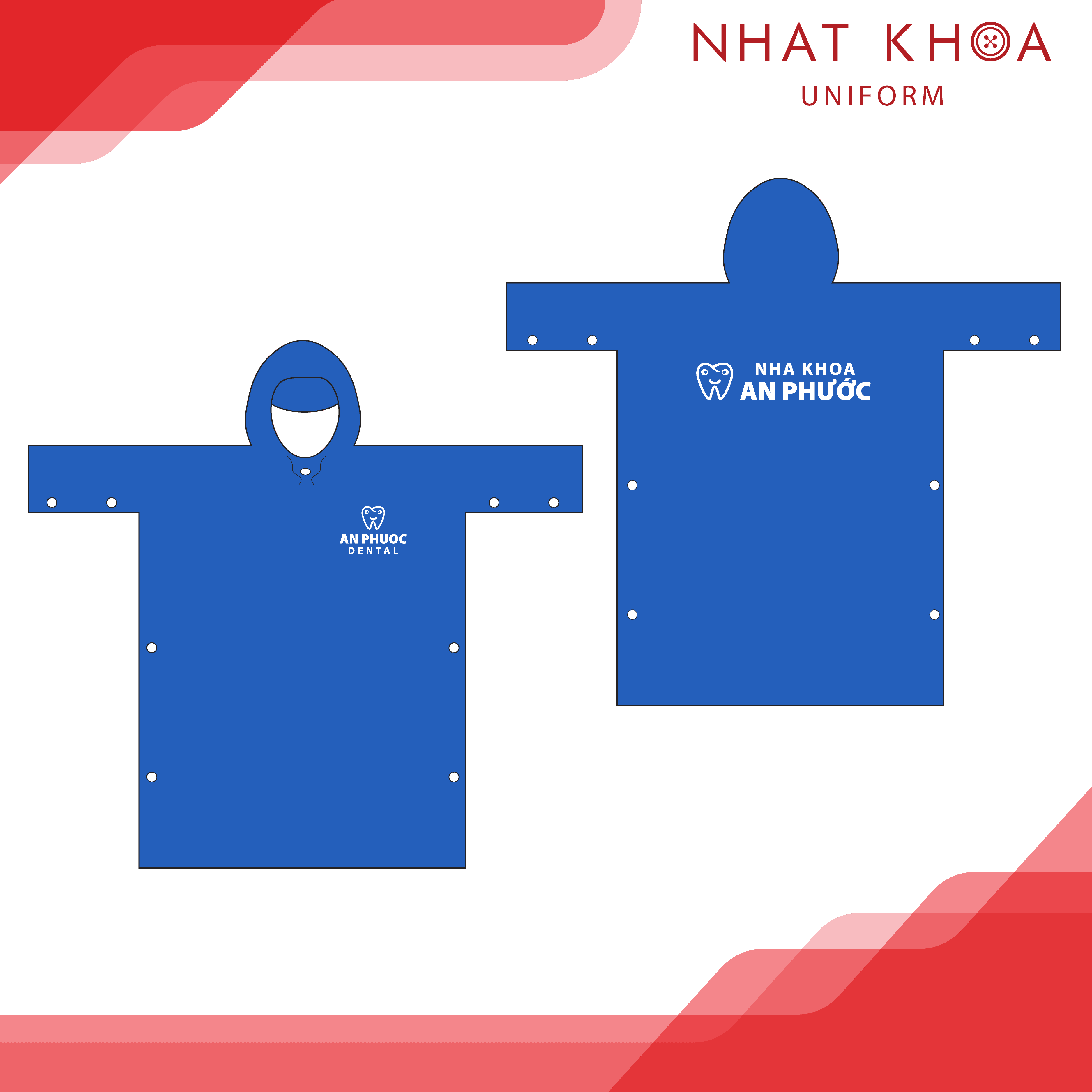 Áo mưa đồng phục Nha Khoa An Phước sở hữu phong cách thiết kế hiện đại với tông màu xanh dương chủ đạo, mang lại cảm giác tin cậy, an tâm và vô cùng chuyên nghiệp. Sự kết hợp giữa sắc xanh đậm và hệ thống nhận diện thương hiệu màu trắng tinh khôi tạo nên một bố cục hài hòa, giúp hình ảnh doanh nghiệp luôn nổi bật và dễ dàng được nhận diện ngay cả trong điều kiện thời tiết mưa gió. Logo Nha Khoa An Phước được đặt trang trọng tại ngực trái và in khổ lớn ở mặt sau, đảm bảo tính thẩm mỹ cao và giá trị quảng bá thương hiệu tối ưu.