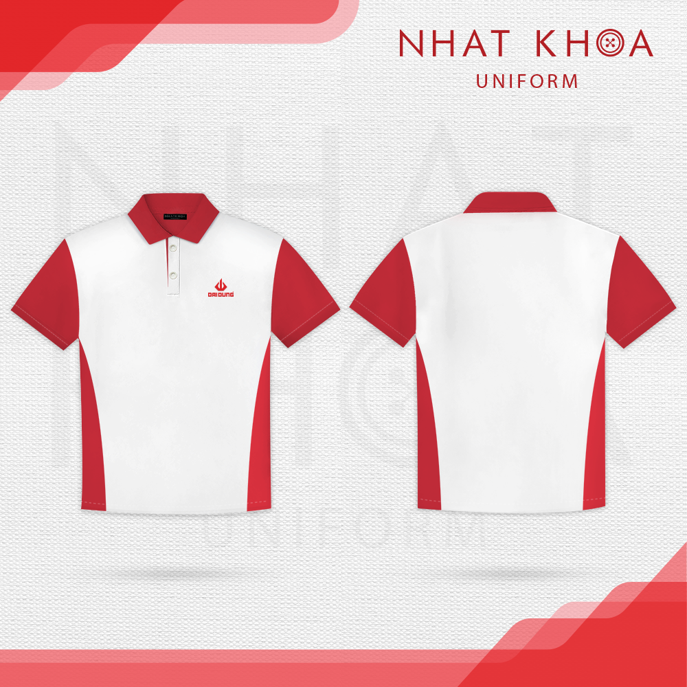 Điểm nhấn kỹ thuật tạo nên giá trị thẩm mỹ cho sản phẩm chính là cấu trúc phối màu đối lập tại phần tay áo và dọc hai bên sườn. Sắc đỏ nồng nàn không chỉ tôn lên bờ vai rộng vững chãi mà còn tạo hiệu ứng thị giác giúp form dáng trở nên gọn gàng, năng động hơn. Cổ áo màu đỏ đồng nhất với mảng phối sườn, kết hợp cùng nẹp cúc trắng phẳng phiu, chứng minh cho quy trình may đo kỹ lưỡng và sự tỉ mỉ trong từng đường kim mũi chỉ. Logo Đại Dũng với biểu tượng ngọn lửa đặc trưng được in thêu sắc nét tại vị trí ngực trái, đảm bảo tính nhận diện thương hiệu một cách trang trọng và tự hào.