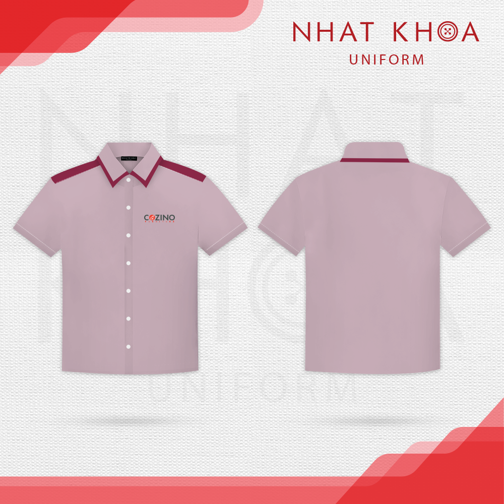 Áo sơ mi đồng phục 8 sở hữu phong cách thiết kế hiện đại, trẻ trung với sự kết hợp màu sắc vô cùng tinh tế và thời thượng. Trên nền vải màu tím nhạt thanh lịch, các chi tiết phối màu đỏ đô ở cổ áo và cầu vai tạo nên một bố cục thị giác ấn tượng, mang lại vẻ ngoài năng động nhưng vẫn giữ được nét chỉn chu cần có của trang phục công sở. Logo Cozino được in cân đối tại ngực trái với tông màu đỏ đồng điệu, không chỉ tạo điểm nhấn thẩm mỹ mà còn gia tăng hiệu quả nhận diện thương hiệu một cách chuyên nghiệp.