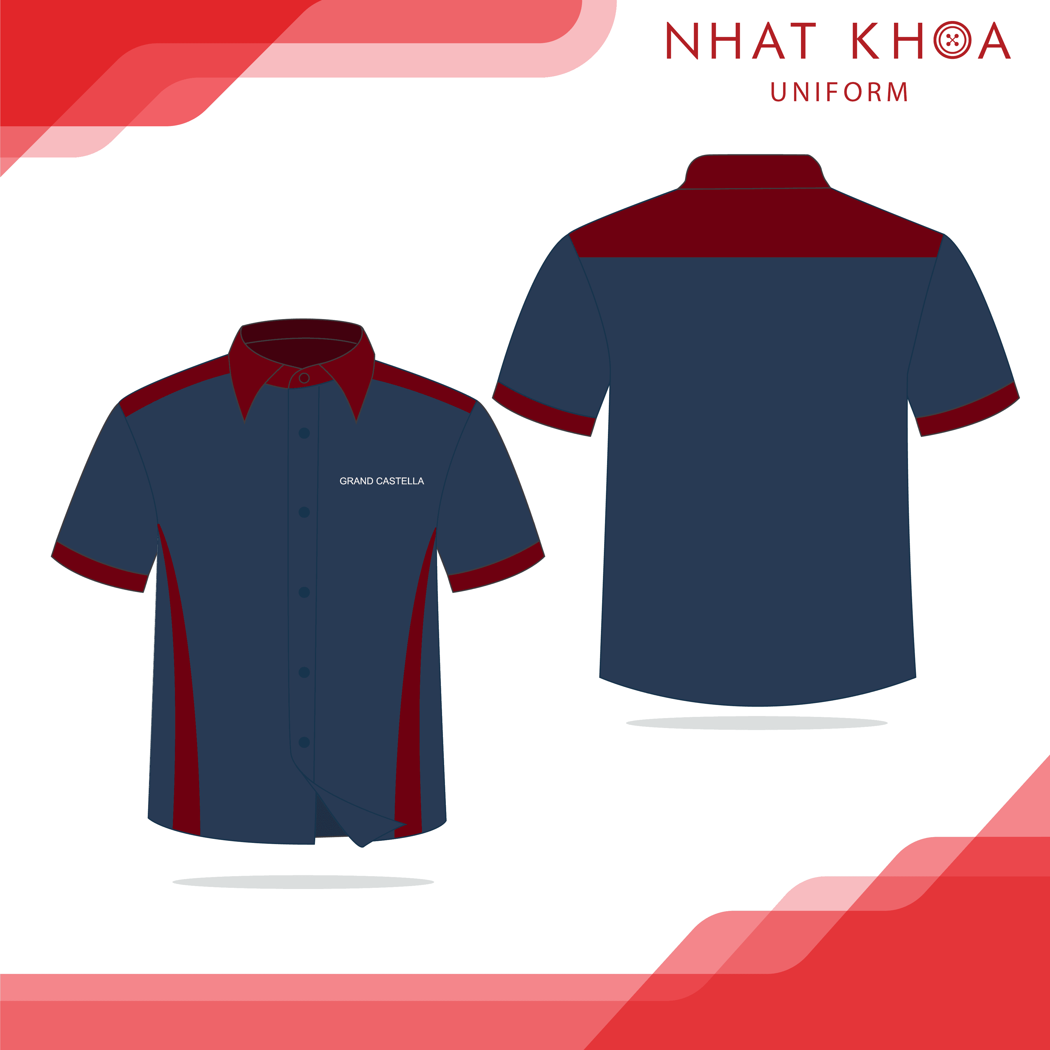Áo sơ mi đồng phục Grand Castella mang phong cách thiết kế mạnh mẽ và chuyên nghiệp, thể hiện rõ nét đặc trưng của một thương hiệu ẩm thực cao cấp. Sự kết hợp giữa tông màu xanh đen (navy) chủ đạo và các chi tiết phối đỏ đô tạo nên một bố cục màu sắc vững chãi, sang trọng và đầy tính thẩm mỹ. Logo thương hiệu được in tinh tế tại ngực trái với tông màu trắng nổi bật, đảm bảo khả năng nhận diện thương hiệu tối ưu và tạo sự cân bằng hoàn hảo cho tổng thể trang phục.