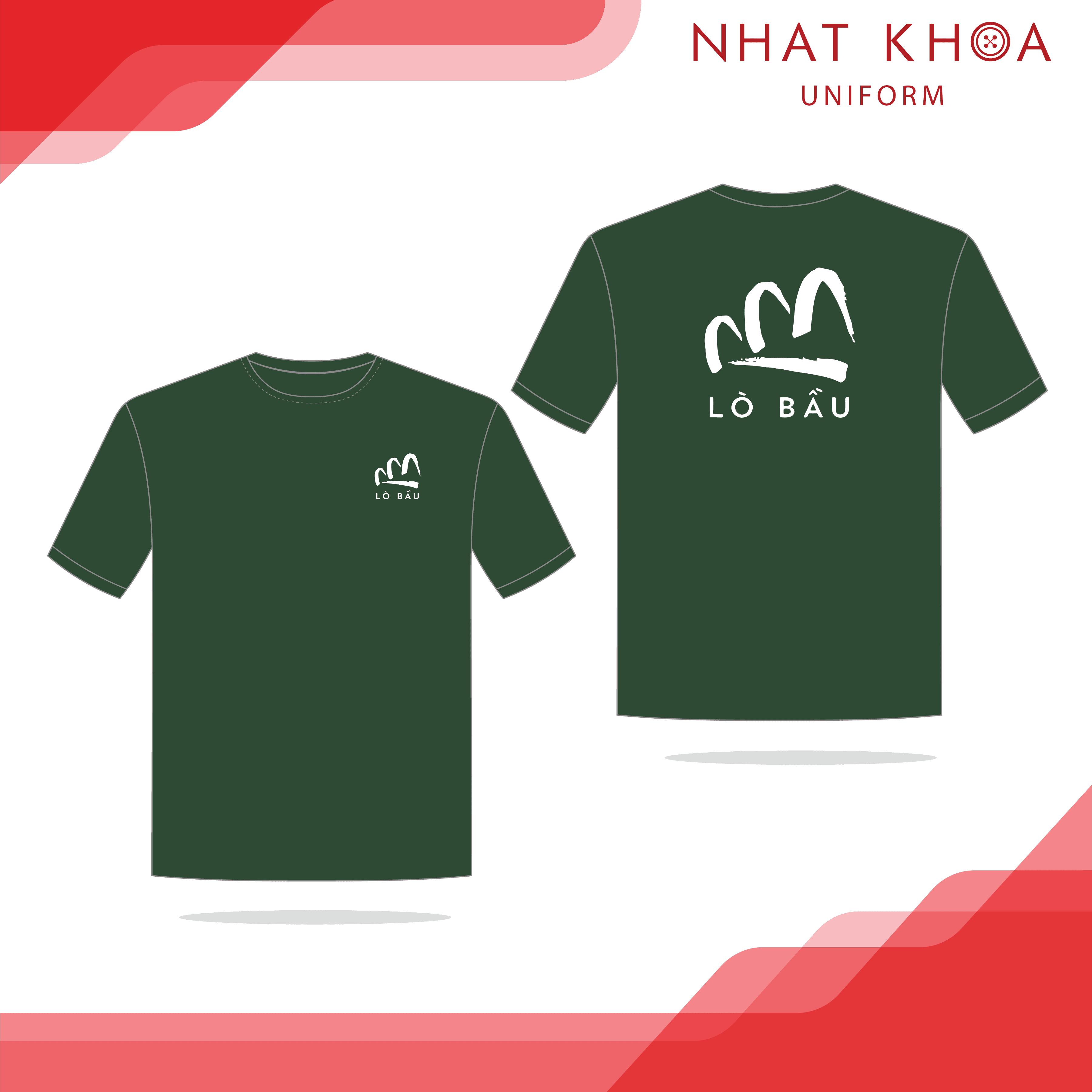 Áo thun đồng phục Lò Bầu mang phong cách thiết kế tối giản, tập trung vào sự tinh tế và cảm giác gần gũi, mộc mạc đúng như tên gọi của thương hiệu. Với tông màu xanh lục đậm (forest green) làm chủ đạo, sản phẩm gợi liên tưởng đến sự tự nhiên, bền vững và tạo cảm giác dễ chịu cho người đối diện. Bố cục nhận diện thương hiệu được sắp xếp truyền thống với logo cách điệu nhỏ gọn tại ngực trái và phiên bản phóng lớn ấn tượng ở sau lưng, giúp khẳng định bản sắc riêng một cách rõ nét và chuyên nghiệp.
