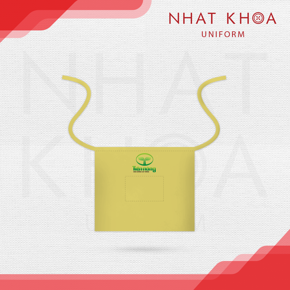 Tạp dề đồng phục Tiến Nông mang thiết kế đơn giản, gọn gàng với gam màu vàng nhạt nhẹ nhàng, tạo cảm giác sạch sẽ và thân thiện. Logo Tiến Nông được in nổi bật ở ngực trước với sắc xanh đặc trưng, giúp tăng khả năng nhận diện thương hiệu và phù hợp với các môi trường làm việc cần sự chỉn chu, đồng bộ và gần gũi.